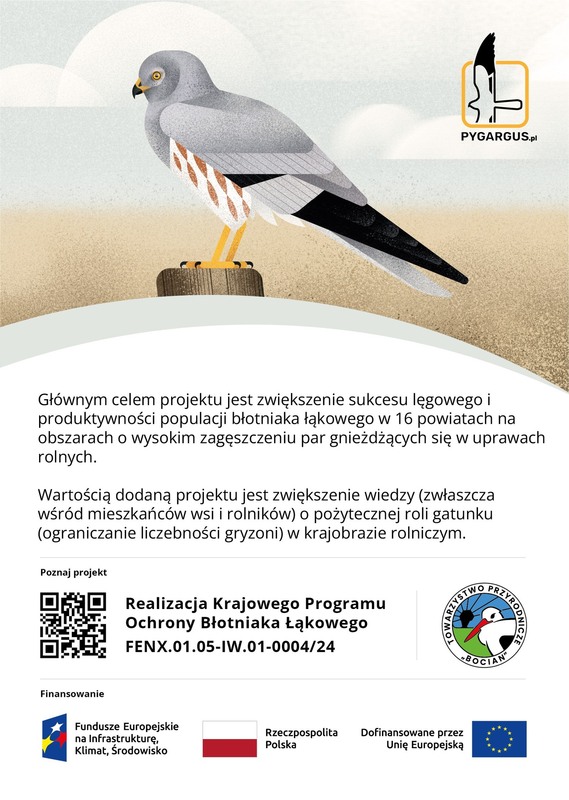 Projekt FENX.01.05-IW.01-0004/24 pt. „Realizacja Krajowego Programu Ochrony Błotniaka Łąkowego” jest realizowany przez Towarzystwo Przyrodnicze "Bocian" w latach 2025-2027 i współfinansowany (85%) z UE w ramach Program Fundusze Europejskie na Infrastrukturę, Klimat, Środowisko 2021-2027.